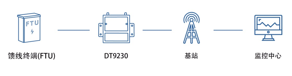 借助運營商網(wǎng)絡監(jiān)控FTU裝置,實現(xiàn)遙測、遙信、遙調(diào)及故障監(jiān)測,用DT9230與配電自動化主站通信,提供開關狀態(tài)、電能參數(shù)及各類故障信息,